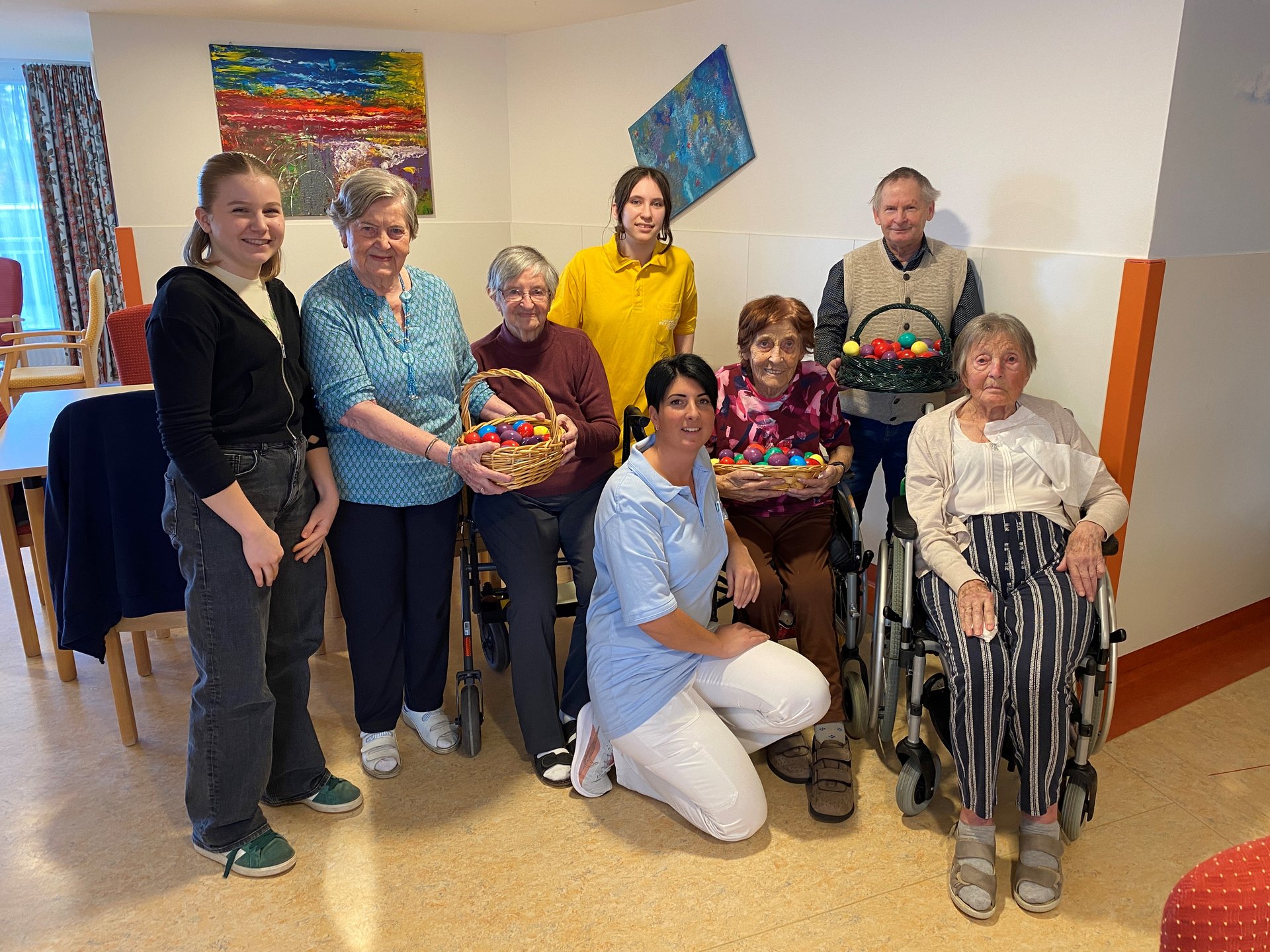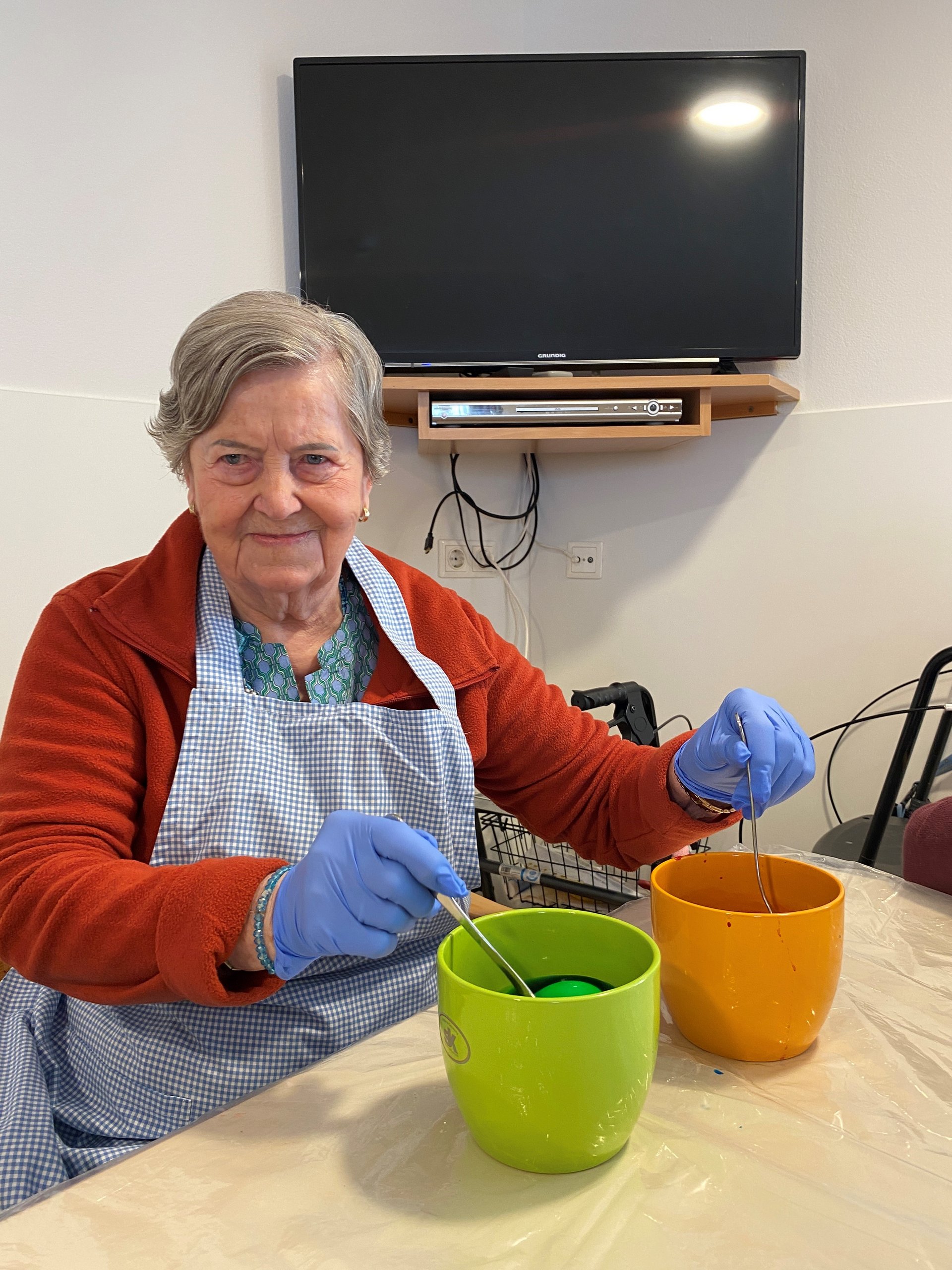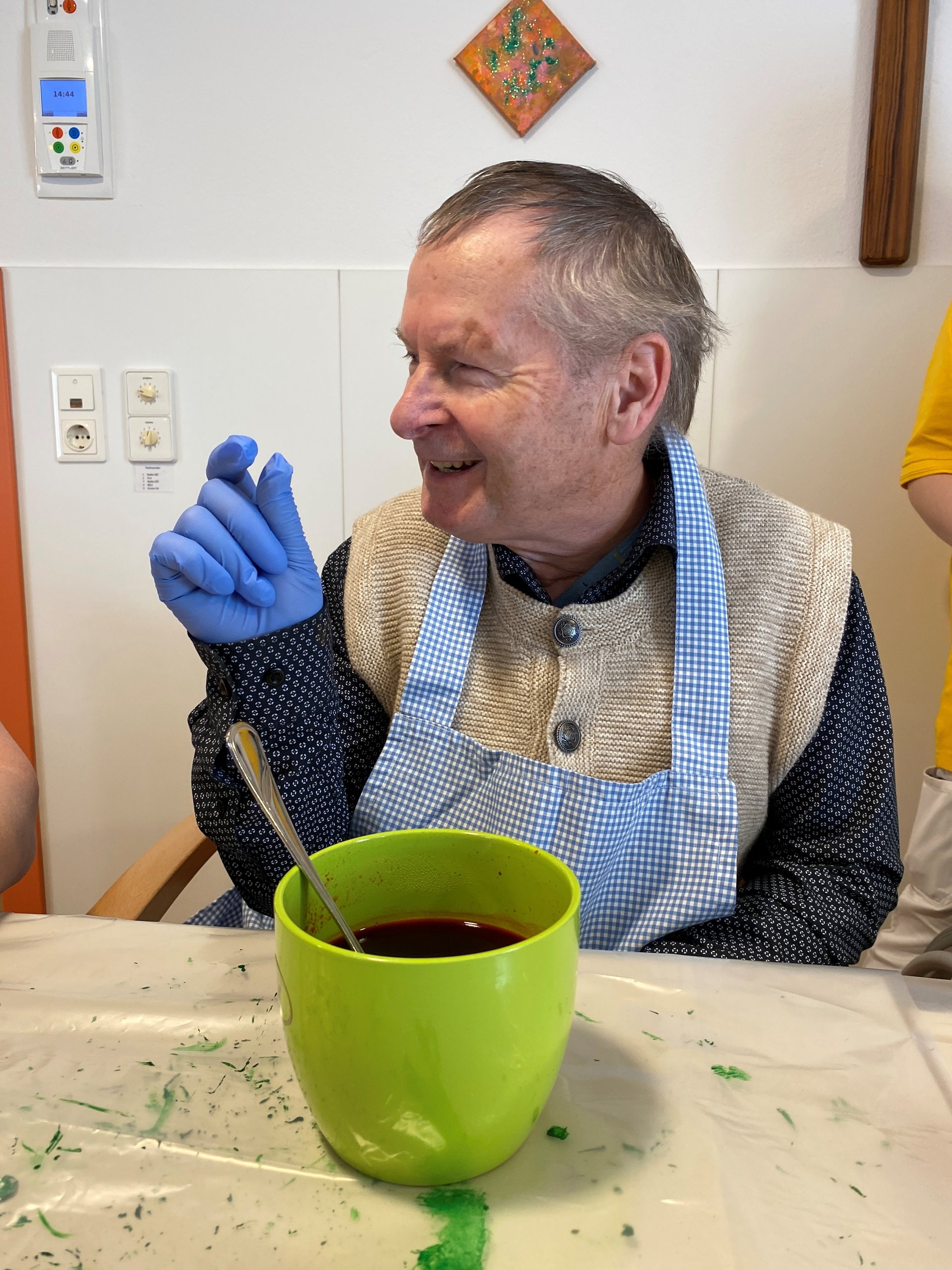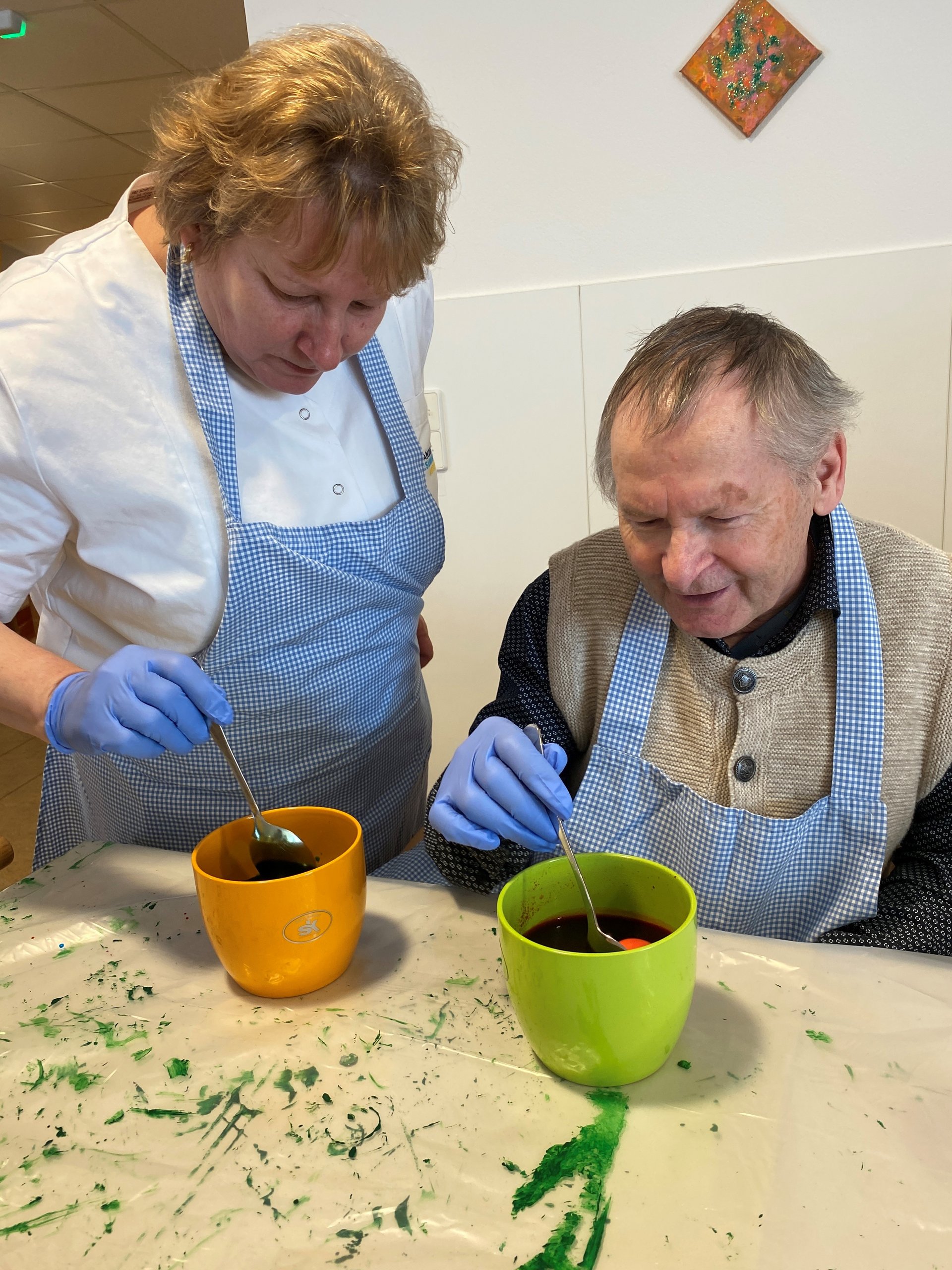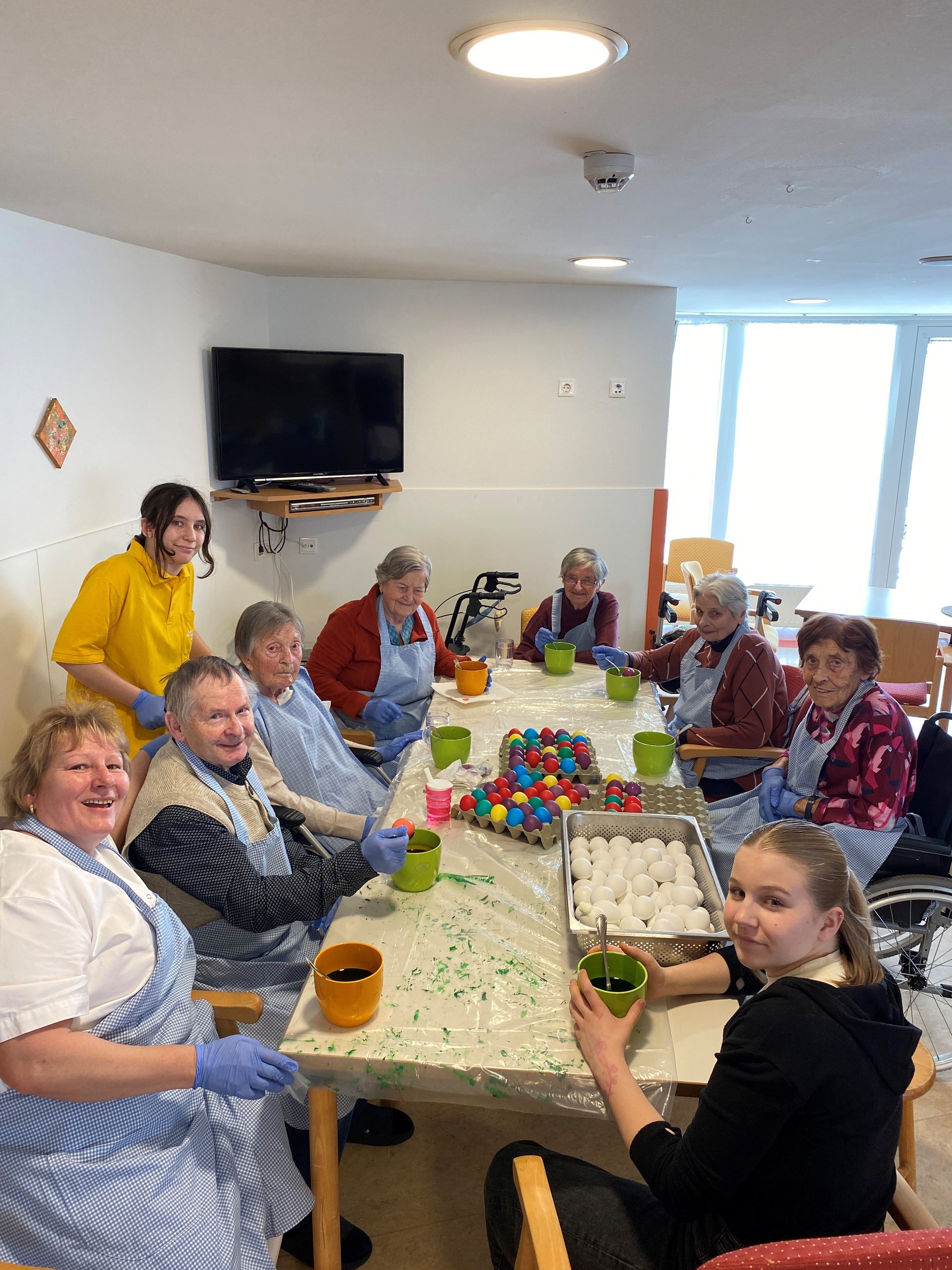 Das Färben von Ostereiern ist eine schöne Tradition, die Freude und Gemeinschaft bringt. Gemeinsam wählen wir die Farben aus, tauchen die Eier mit Vorsicht in die Farbe und beobachten, wie sich die Eier bunt verwandeln. Dabei entstehen nicht nur farbenfrohe Kunstwerke, sondern auch viele schöne Gespräche und Erinnerungen. Das gemeinsame Gestalten stärkt das Miteinander und bringt ein Stück Osterfreude in den Alltag.